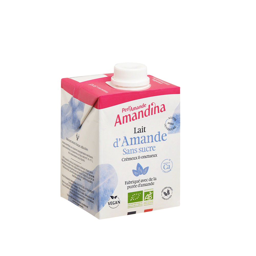 Découvrez notre lait d’amande bio Amandina sans sucre, idéal pour votre petit déjeuner, en préparation de vos recettes de cuisine ou tout simplement en boisson fraiche. Source de fibres et de vitamine E, l’Amandina sans sucre est une véritable boisson saine 100% végétale sans gluten & vegan.